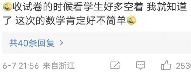 也有监考老师在网上表示,收试卷的时候看见很多考生空着题目,就知道这次浙江高考数学难度又是一个新的高度。