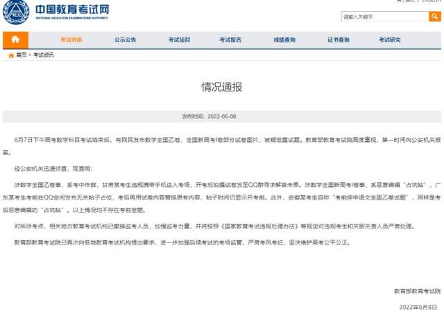 大家不要担心,数学全国乙卷事,系考中作弊,甘肃某考生违规携带手机进入考场,开考后拍摄试卷发至QQ群寻求解答未果。涉数学全国新高考I卷事,系恶意编辑“占坑帖”,广东某考生考前在QQ空间发布无关帖子占位,考后再用试卷内容替换原有内容,帖子时间仍显示开考前。此外,安徽某考生自称“考前押中语文全国乙卷试题”,同样是考后恶意编辑的“占坑帖”。以上情况均不存在考前泄题。